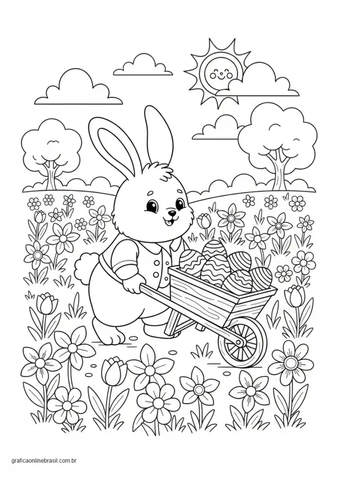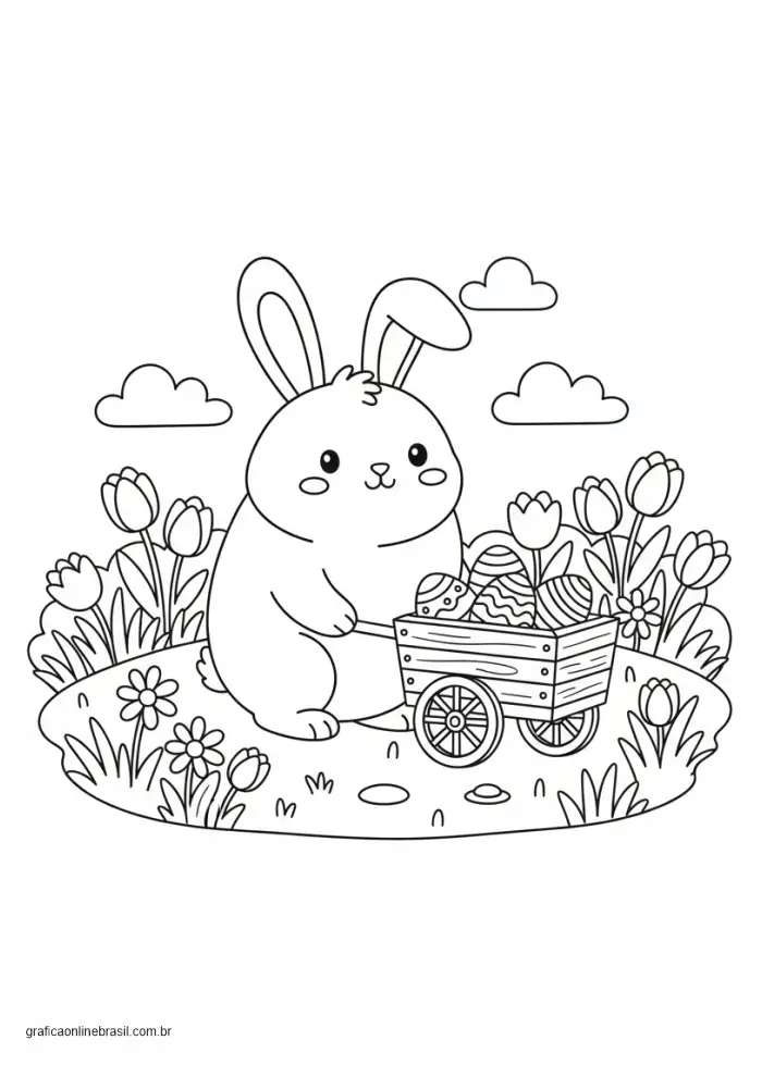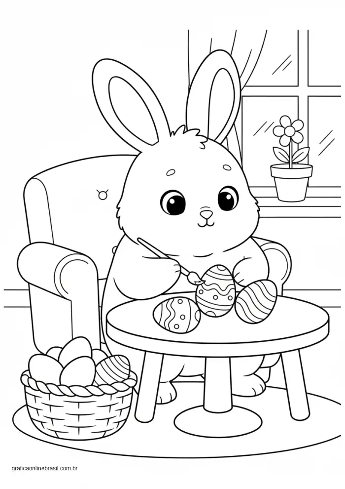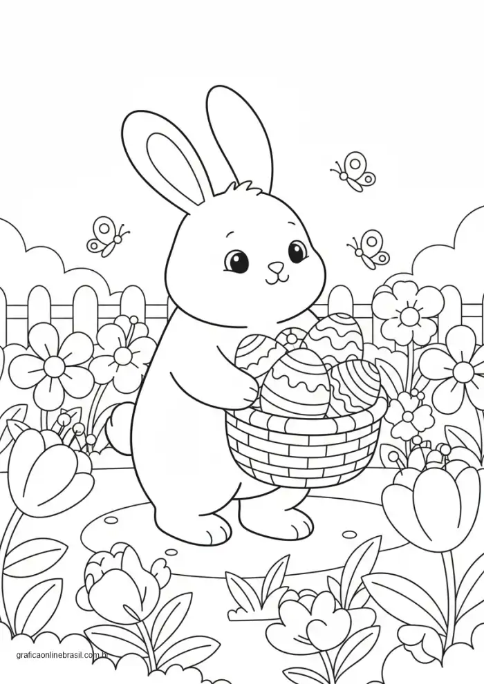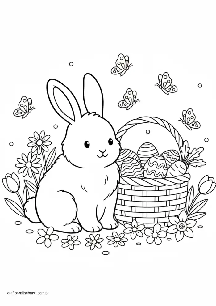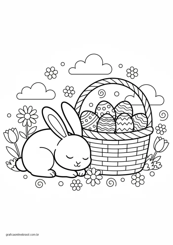 Nesta página você encontrará ilustrações fofas inspiradas no clima da Páscoa, com coelhinhos, ovos decorados, pintinhos e cestas cheias de surpresas. Os desenhos possuem traços simples e delicados, ideais para crianças de diferentes idades aproveitarem momentos de diversão com lápis de cor, giz de cera ou canetinhas.