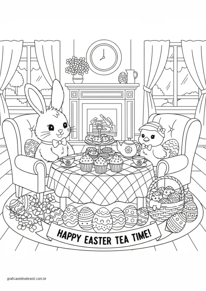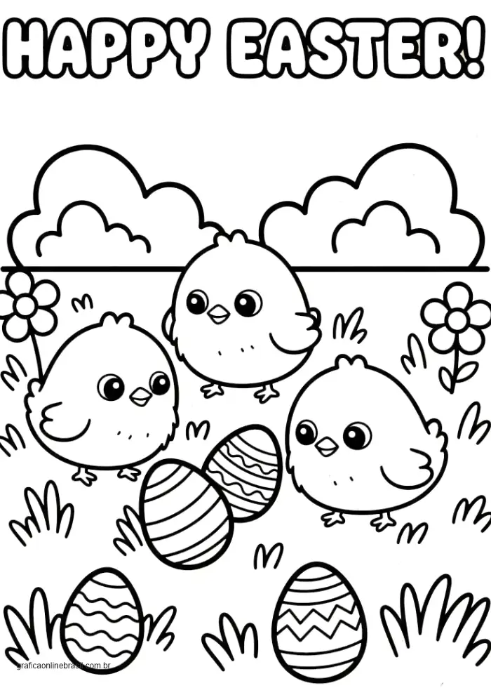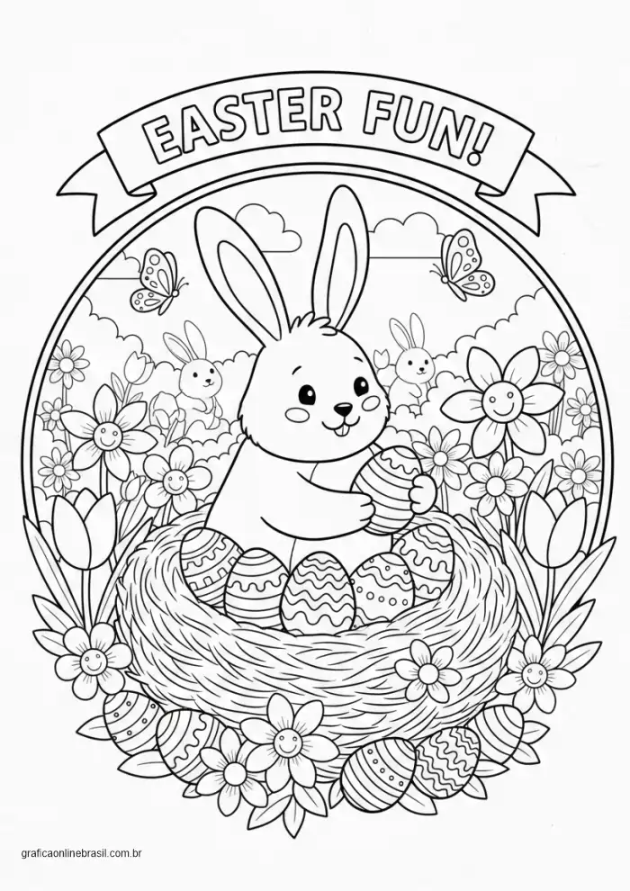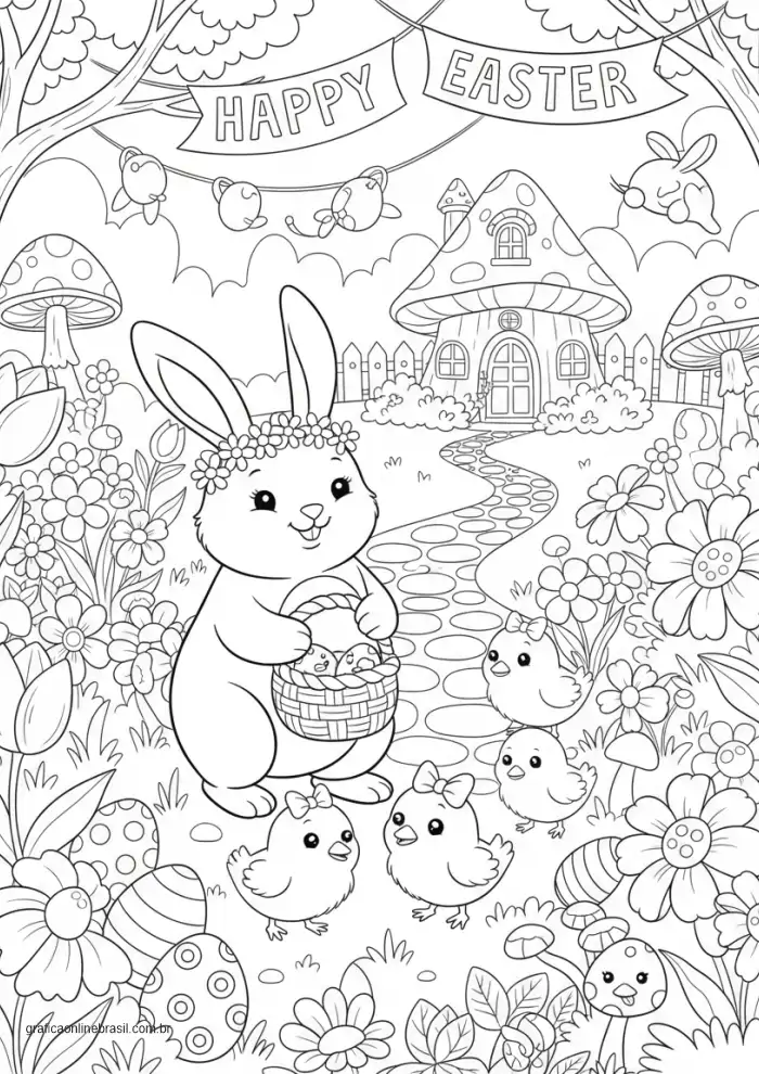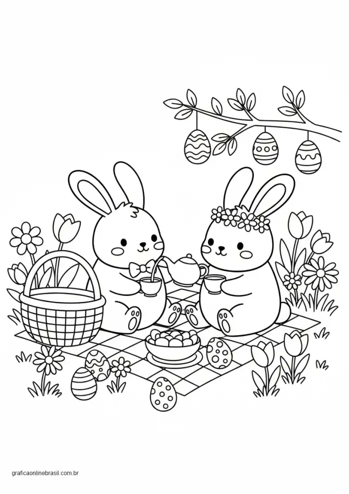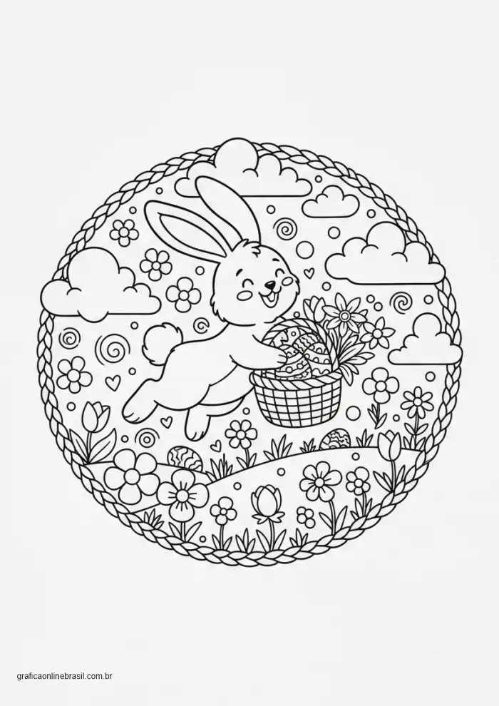 Nesta página você encontrará ilustrações fofas inspiradas no clima da Páscoa, com coelhinhos, ovos decorados, pintinhos e cestas cheias de surpresas. Os desenhos possuem traços simples e delicados, ideais para crianças de diferentes idades aproveitarem momentos de diversão com lápis de cor, giz de cera ou canetinhas.